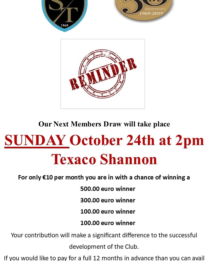 Our next members draw will take place this Saturday at 2pm in Texaco Shannon. Thank you @oconnorstexaco @texacoshannon for providing the venue for our draw during these challenging times. Funds from this draw are vital as they go straight towards the building of our New Clubhouse. As always Thank you for your continued support